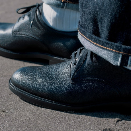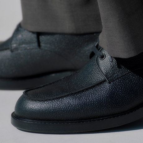 深めのシボが特徴のグレインレザーが上品なカジュアル感を表現。平ひもと裏ハトメ、L字ウェルトのステッチがドレスカジュアルの雰囲気を醸成する。GORE-TEXファブリクスが優れた防水耐久性と透湿性を発揮。パイピング処理された端部が品格と耐久性を両立する。