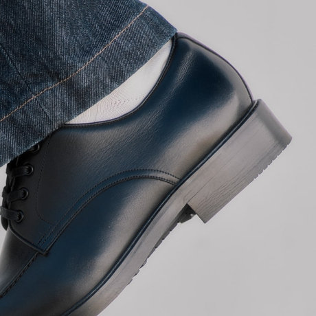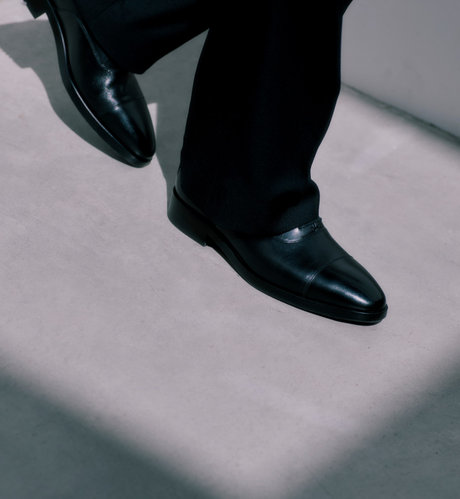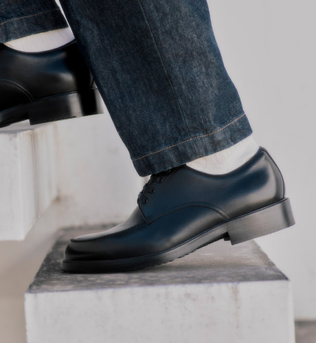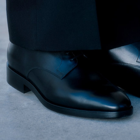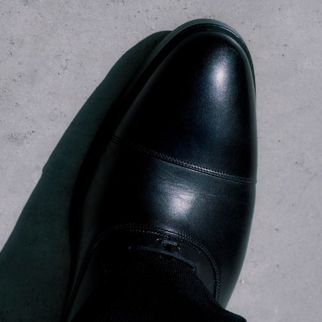 深みのある艶を表現した上質なステアレザーを採用。端処理に折り返しステッチを施すことで、洗練された品格を醸し出す。中足部のHARD E.V.A.がねじれを軽減して安定した足運びを提供。レザーソールを思わせる黒味の強い艶のコバが格式を高めた一足。