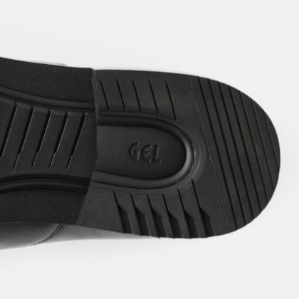 アッパーに内蔵されたフォーム材が心地よいフィット感を提供。足裏全面に配されたfuzeGELが衝撃を緩衝し、長時間の歩行による足への負担を軽減する。深みのある艶を強調したレザーが高級感を漂わせ、前側メッシュ、後側人工皮革の中敷きが快適な履き心地を叶える。