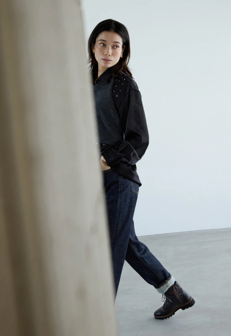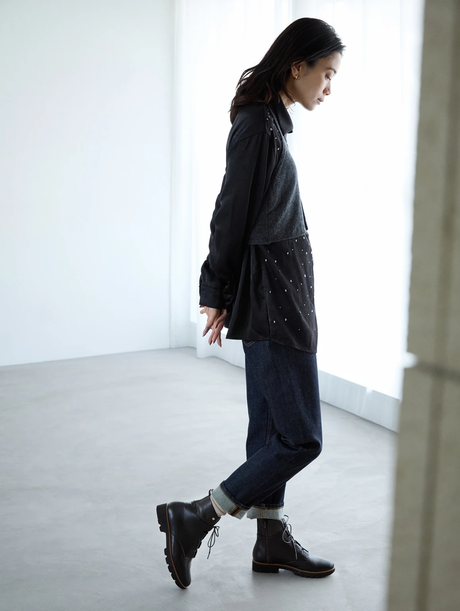 ほんのり武⾻なコーヒーカラーのミドルブーツを、ブラックのとろみシャツとチャコールグレーのニットベストで都会的に。