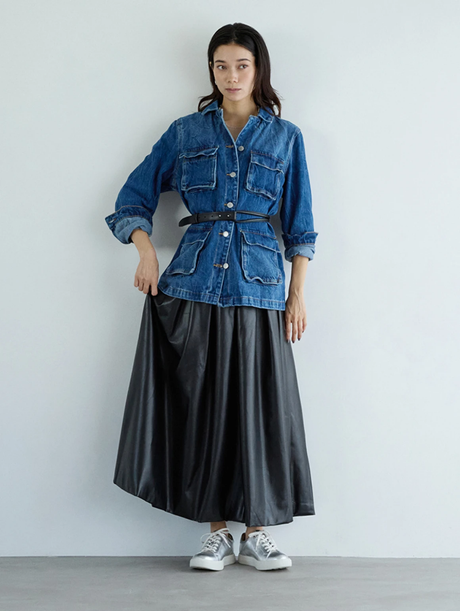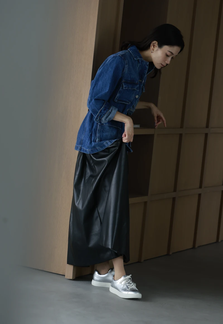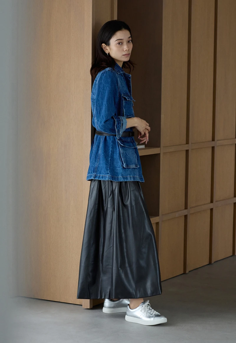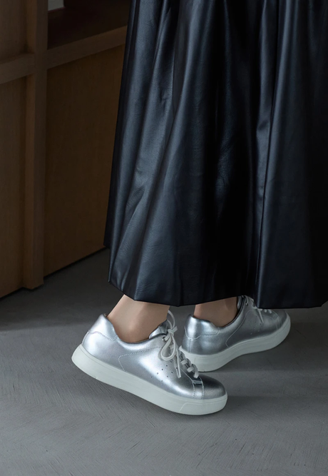 メタリックなシルバースニーカーをアクセントに、レザーのフレアスカートでほんのりモード感を演出。