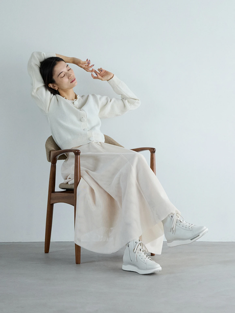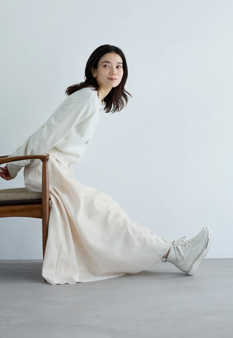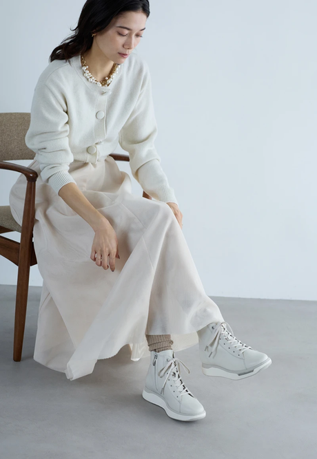 オフホワイトのミドルブーツを主役に、全⾝を同系色でまとめた軽やかなスタイル。くるみボタンのニットカーデと、ふんわり広がるメッシュがレイヤードされたフレアスカートが優しさを添えつつ、ほどよい存在感に。