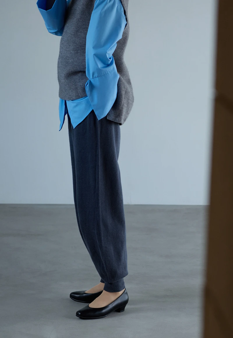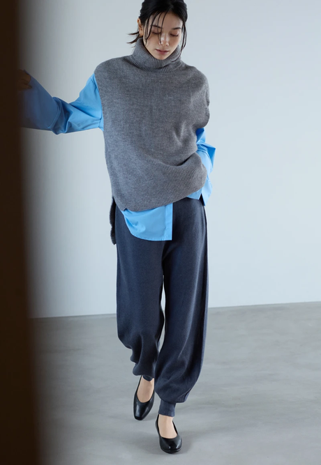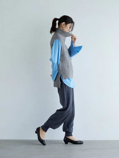 ブルーシャツにグレーのニットベストを重ねて、オフィスにも馴染むきれいめスタイルに。