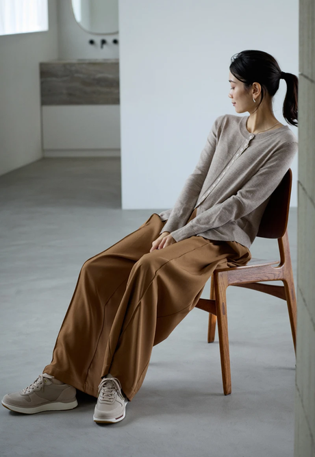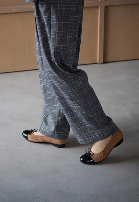 光沢のある⽩トップスを合わせて、ほどよいツヤ感とフェミニンさをプラス。キャメルとのバイカラーバレエシューズが、コーデ全体を引き締めつつ、親しみやすさも演出してくれる。トラッドにほんのり⽢さを添えて、⼤⼈の余裕を。PEDALA FLAT CASUAL
