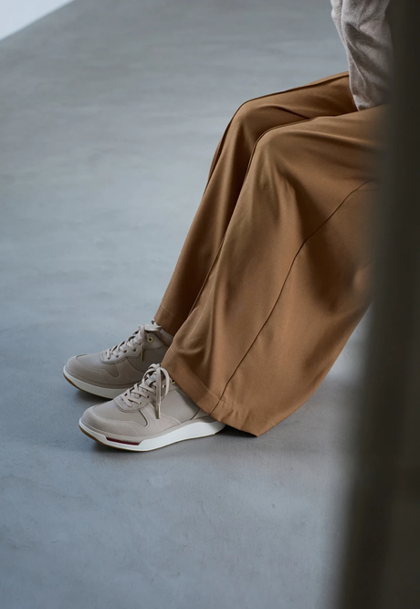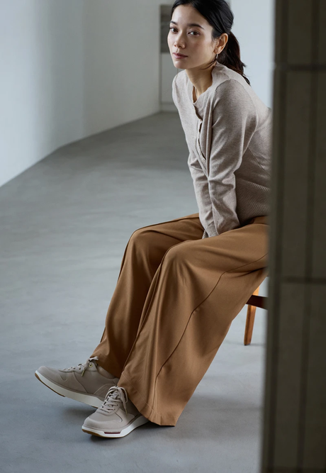 ナチュラルカラーのスニーカーは全体にニュアンスをプラスしてくれる優秀アイテム。ワントーンでつくる、⼤⼈のマニッシュスタイル。PEDALA RIDEWALK 2