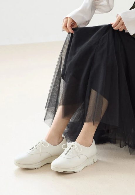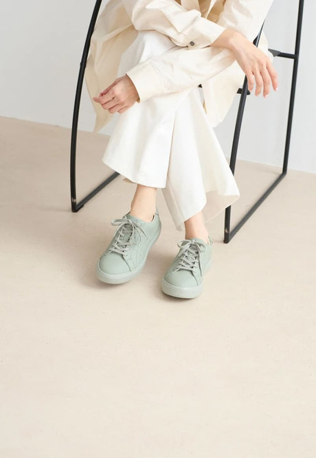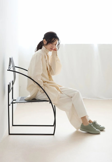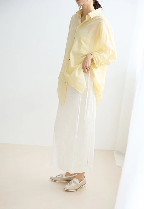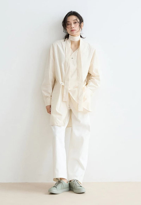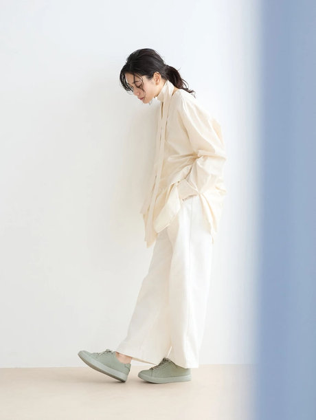 今では定番のタイ付きのブラウスやホワイトデニムなら難しいと思えるワンカラーのレイヤリングも取り⼊れやすく、⾜元にやわらかいカラーのアクセントがあることでオーバーサイズの組み合わせでも⼩粋な印象に。PEDALA LIGHT X