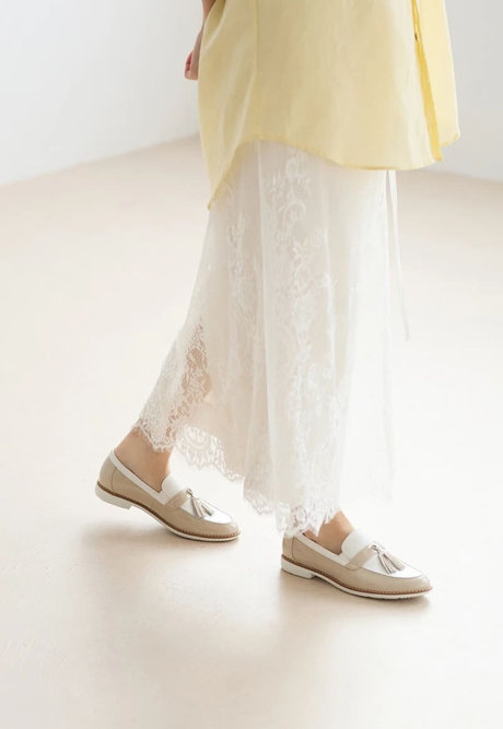 肌馴染みの良いベージュ × ホワイトカラーのローファーには揺れるタッセル、さりげなくレイヤードしたレーススカートで⾜元にソフトな奥⾏きと躍動感を。