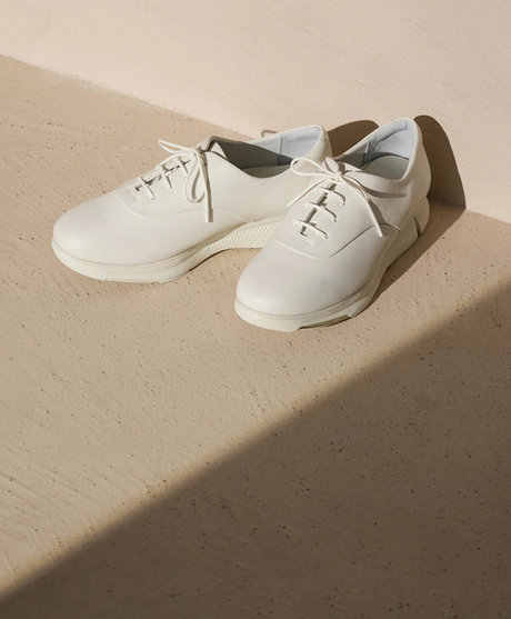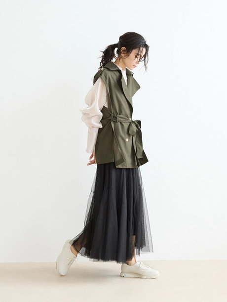 オフホワイトのハンサム(マニッシュ)なレースアップシューズにはトレンドのトレンチコートのエッセンスをベストに落とし込んで。