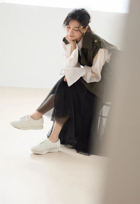 シアー素材のブラウスとエアリーなチュールスカートを合わせてやわらかさを取り⼊れながら凛とした⼥性のエレガントなスタイルに。PEDALA RIDEWALK CONNECT 2