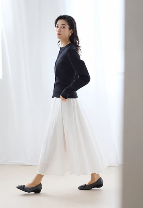 旬のホワイトレイヤードコーデはニュアンスカラーのシューズで優しいアクセントを。