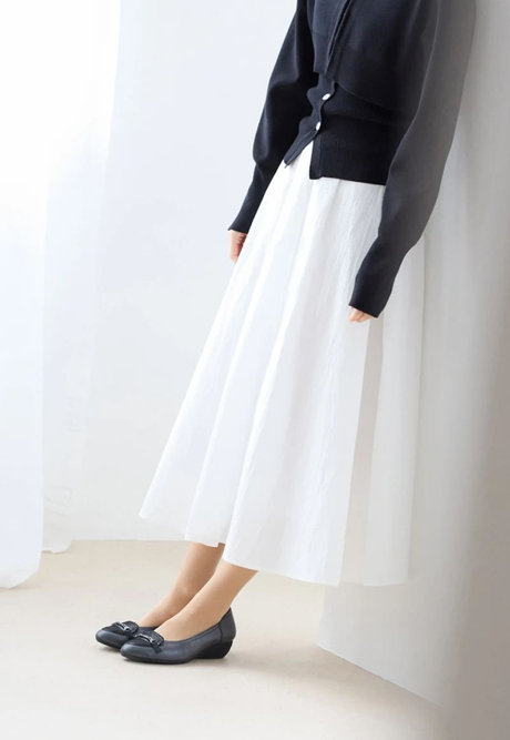 素足のような軽さと、長時間の歩行にも対応する機能性が特徴のローヒールパンプス。 甲にリボンをあしらったフェミニンなデザインで、やわらかな履き心地の1足です。