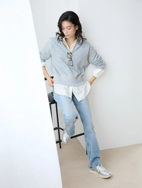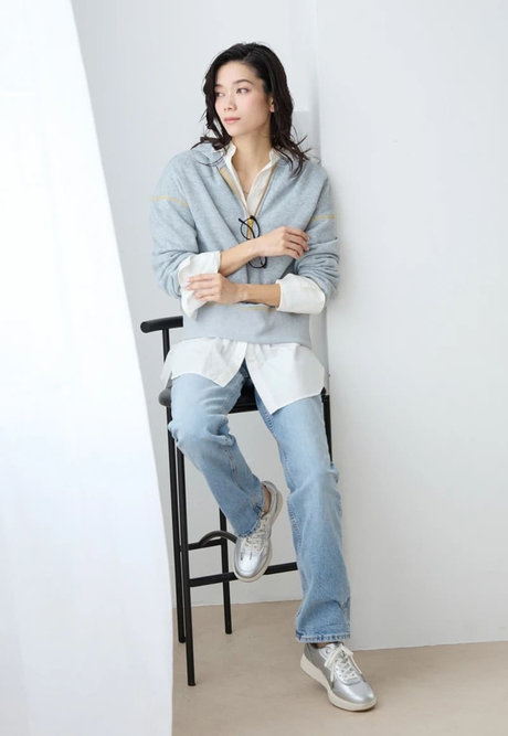 メタリックなシルバーのスニーカーをアクセントにシャツ・スウェット・デニムの王道カジュアルコーデ。