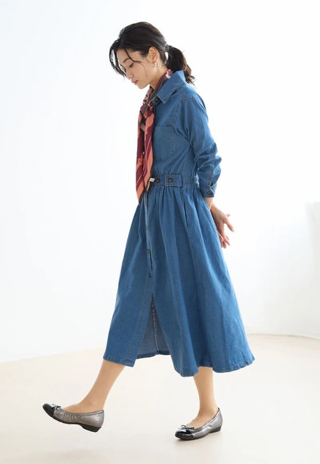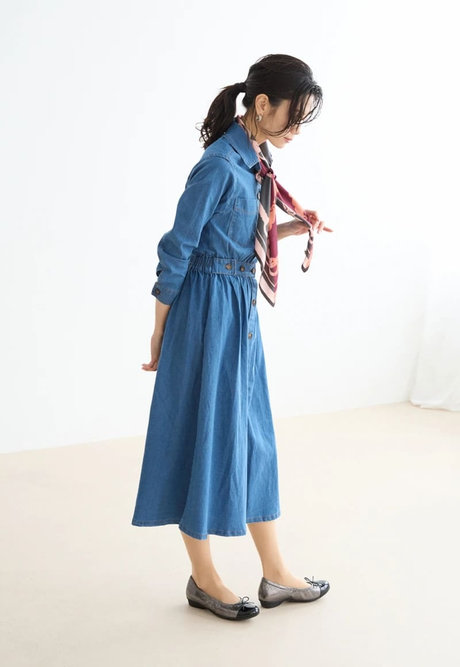 カジュアルなデニムをドレスアップしてくれるガンメタルのバレエパンプスを主役に、柄スカーフでパリジェンヌを気取って。