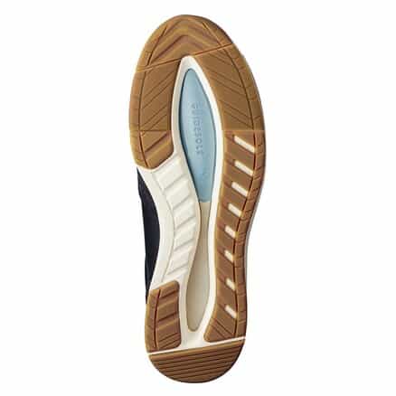 土踏まずだけでなく足裏中央(母指球横)にも膨らみがあり、足裏のアーチを支えてくれます。はじめは少し違和感があるが慣れてくるとこの効果を実感できます。また着地のショック減衰だけでなく蹴り出しに弾みがありスイスイ歩くことができ駅の階段昇降も楽に。長時間歩行の疲れ方が少ないですね。