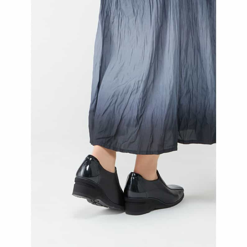 4.5㎝のヒール高を感じさせない歩きやすさ。ソール部分にクッション性があり、ヒールも固い素材ではないのでひざや腰に負担も少ないと思います。この色は撥水性があるようなので、小雨の日も歩けます。