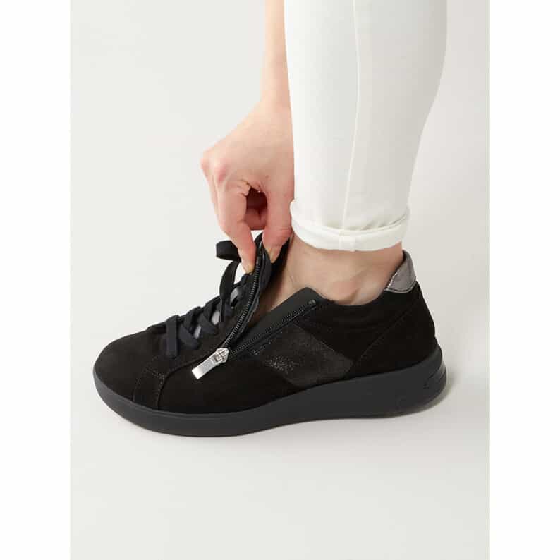 ファスナーが付いているので脱ぎ履きが楽ですが、中敷が滑らない素材なので、脱ぐ際戸惑いますが慣れれば問題ないです。何より足首まであるので足をフォールドしてくれ安定感があります。