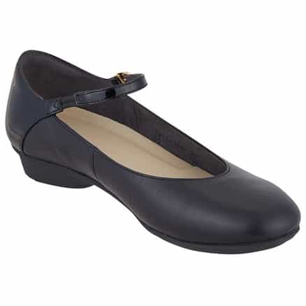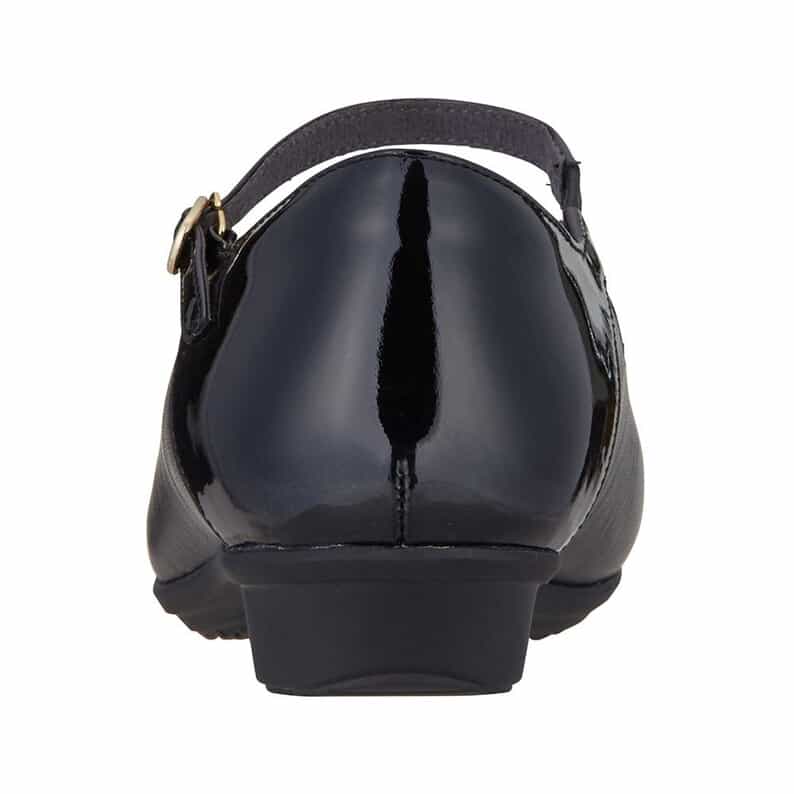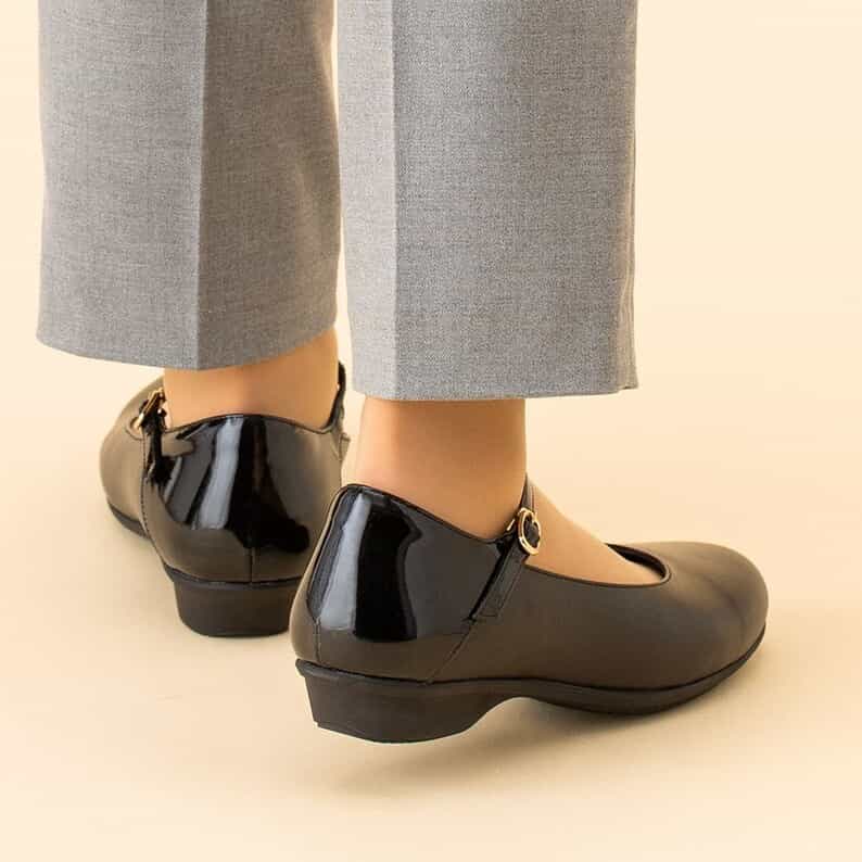 似たようなストラップの靴の中でも形の美しさが気に入って購入しました。EEEで横幅がゆったりした履き心地ですが、見た目はほっそり見えます。ストラップがありますので、前に滑って指先が詰まることはありません。シンプルなデザインなので何にでも合わせられそうですが、ワンピース類に合わせるのが楽しみです。