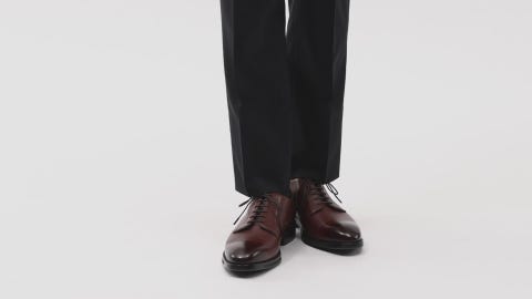 つま先部がシンプルな外羽根プレーン、セミスクエアシルエットのドレスシューズ。防水透湿性に優れるゴアテックスファブリクスをライニングに使用しています。アッパーにはイタリア産のきめの細かい上質なスムースレザーを採用。シャドースプレーのツヤを強調し、高級感を演出しています。インナーソールは足なじみのよいオーソライト中敷。ミッドソールにはクッション性と反発性を併せもつSPEVA、かかと部にfuzeGELを搭載し、快適な歩行をサポートします。中足部はTPUシャンクにより、歩行の安定性に配慮。アウターソールの擦り減りやすい部分には、耐摩耗性に優れたAHARラバーを採用しています。