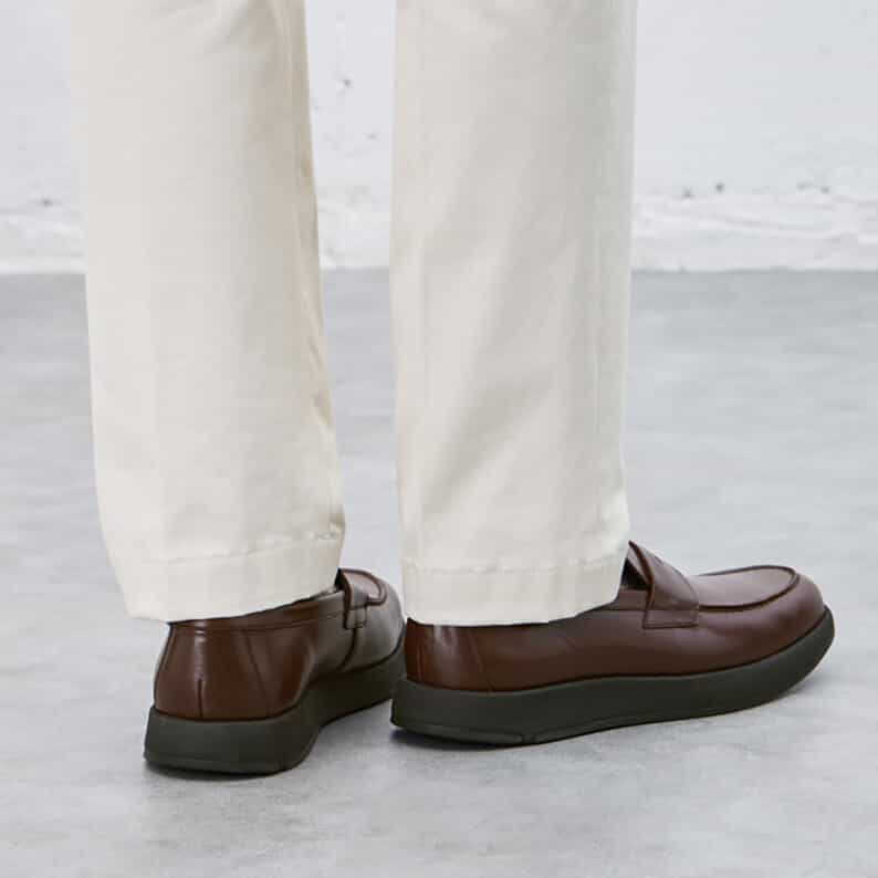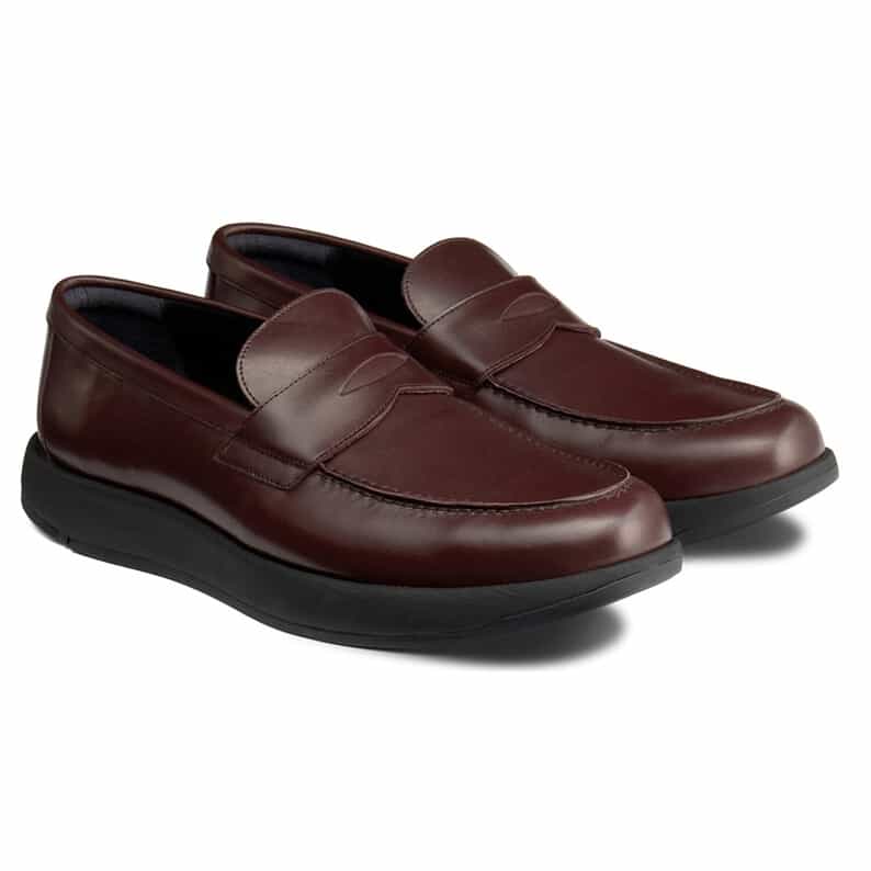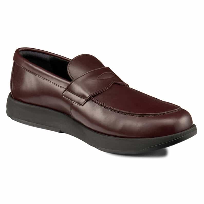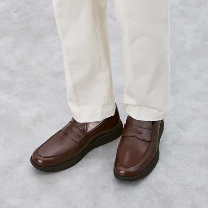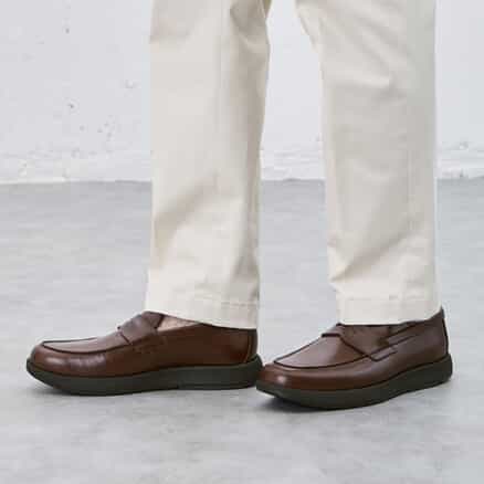 スーツスタイルにも合う、気品をまとったドレススニーカー。品格の高いモカシンです。かぶりがやや深めのローファーデザインで、歩行時にかかとの納まりがよく、快適な歩行をサポートします。アッパーには国産の上質なスムースレザーを採用。ほどよい光沢感でドレッシーな雰囲気を演出します。ライニングの前側にはメッシュ素材を配置し、ソフトな足当たり。インナーソールは足なじみのよいオーソライト中敷。前足部には吸放湿性に優れた人口皮革を配置しています。ミッドソールにはクッション性と反発性を併せもつSpEVA、かかと部に衝撃緩衝機能GELを搭載。アウターソールは耐摩耗性に優れたAHARラバーを採用しています。