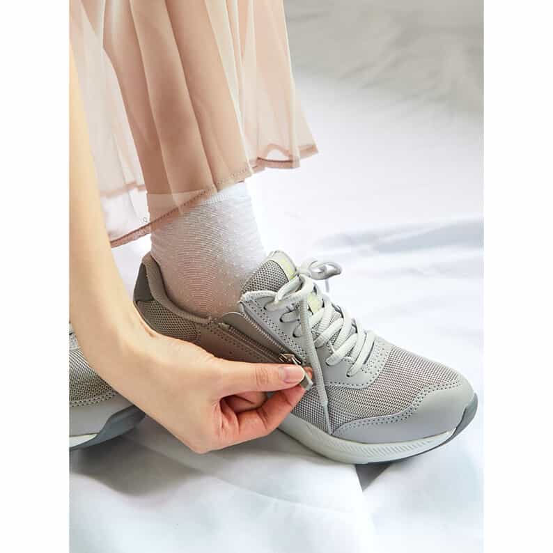 つま先が反り、中足部付近が締まり気味のデザインで、つまずきにくく歩き心地は良好です。形が崩れにくいので、着脱はいい加減にできません。足を守ってくれる一足です。