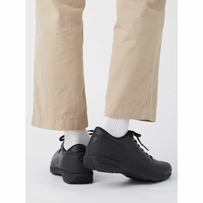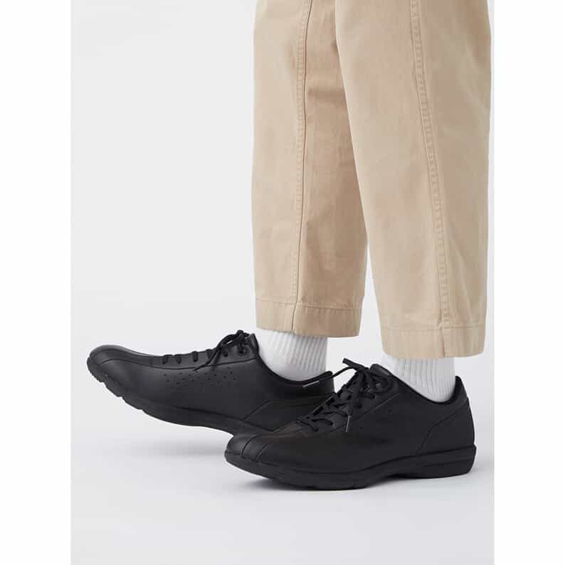 人工革ということですが、よくなめした革のように足を包み込んでくれ、思ったより蒸れを感じません。ソールは絨毯のように柔らかく、かといって地面の感触を伝える情報量もきちんとあります。靴の重さが感じられないほど軽いので、1日平均で10,000歩歩きましたが、革靴の時と違い翌朝に足の疲れに響きません。