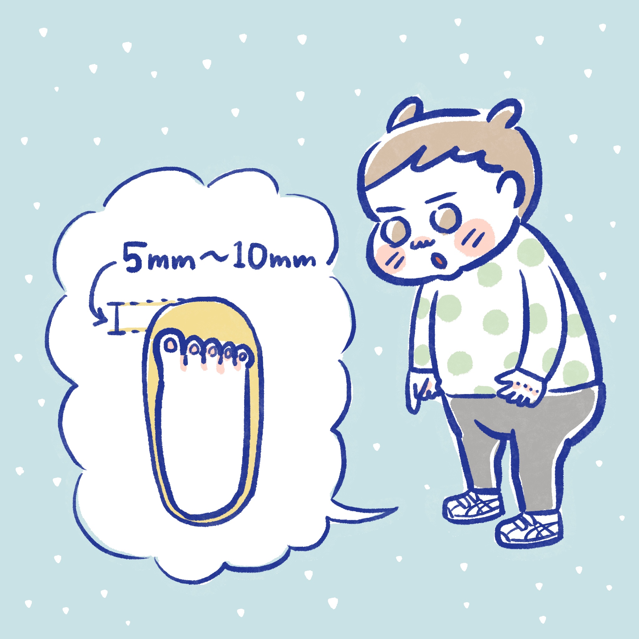 靴下を履いた状態で靴を履いたとき、しっかりと足ゆびを踏ん張って立つためには、つま先には5mm程度のゆとりが必要です。子どもの足は成長しているので、つま先に10mm程度の余裕のある1サイズ大きい靴を買えば、3歳くらいまでは平均で3カ月、その後は平均6カ月が買い替えの目安になります。