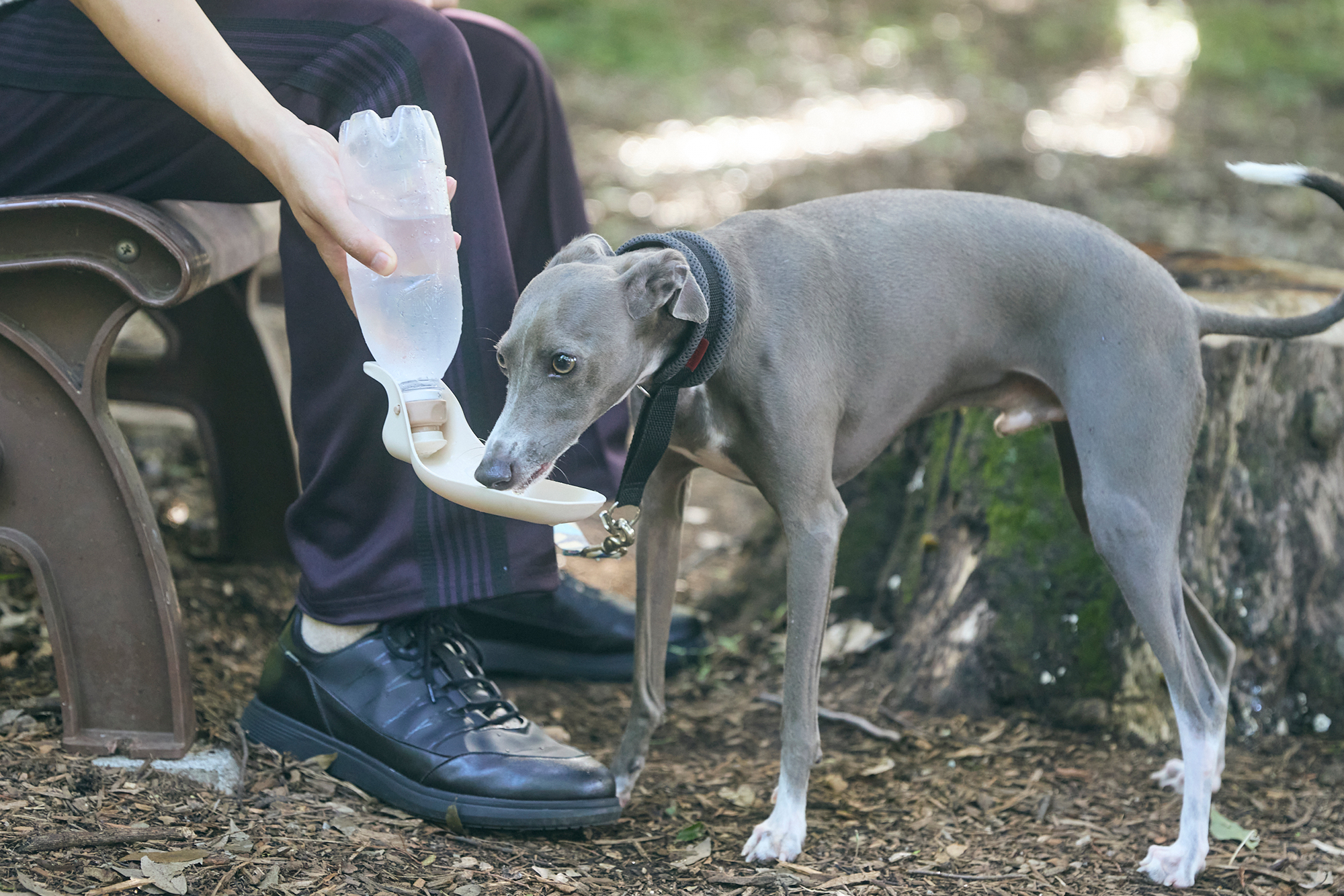 およそ45分から1時間で回れる散歩コースも半分を過ぎました。まだまだ元気なテンちゃんですが、ここで一旦水分補給&おやつタイムです。