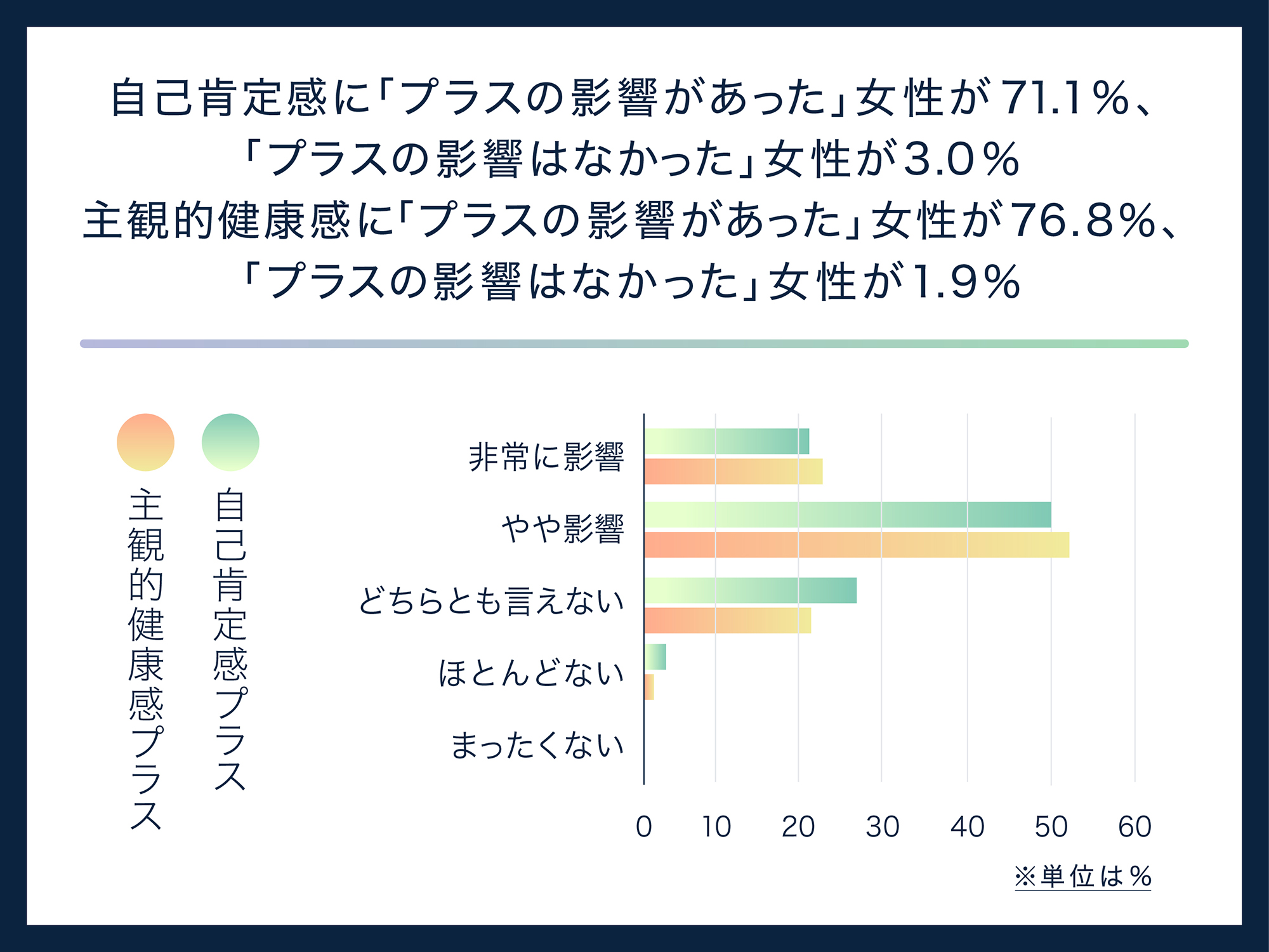 調査結果で特徴的だったのは、フットケアを行う人たちは、自己肯定感や主観的健康感に「プラスの影響があった」と感じている人が多かった点です。自己肯定感で「プラスの影響があった」と感じている人は計71.1%で、「ほとんど影響はなかった」と感じている人の3.0%と大きな差がありました。主観的健康感で「プラスの影響があった」と感じている人は計76.8%で、こちらも「ほとんど影響はなかった」と感じている人の計1.9%と大きな差がありました。