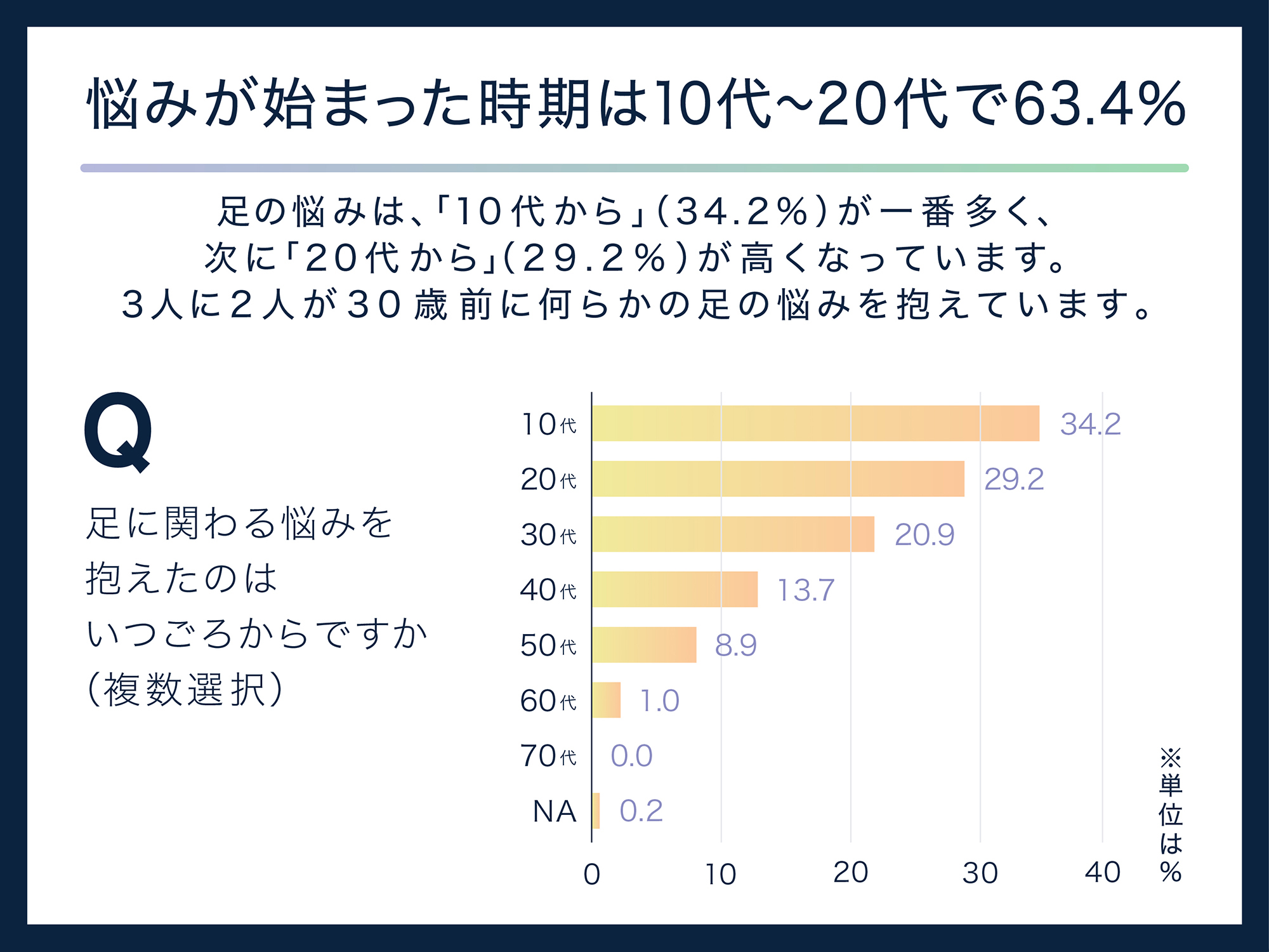 調査では、さまざまな角度から質問しています。「足の悩み」の有無を尋ねたところ、95.4%の人が「持っている」と回答し、その始まりは「10代」が34.2%、「20代」が29.2%と、かなり若い年代からでした。