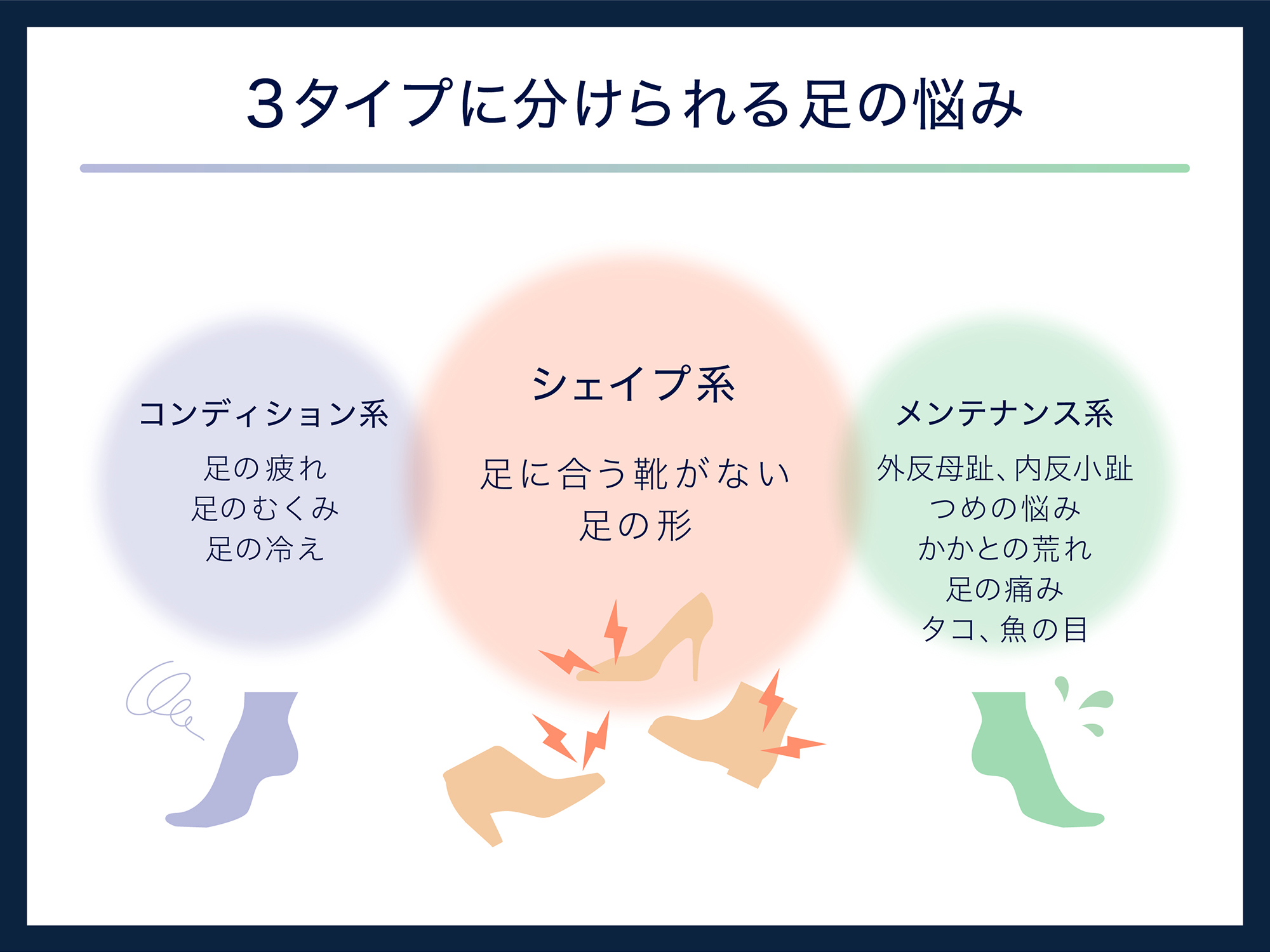 また、「足の悩み」は足全体に関わる「コンディション系の課題」、足の症状悪化や生活への支障に関わる「メンテナンス系の課題」、形状関連の「シェイプ系の課題」に分かれ、これらを併せ持っていました。