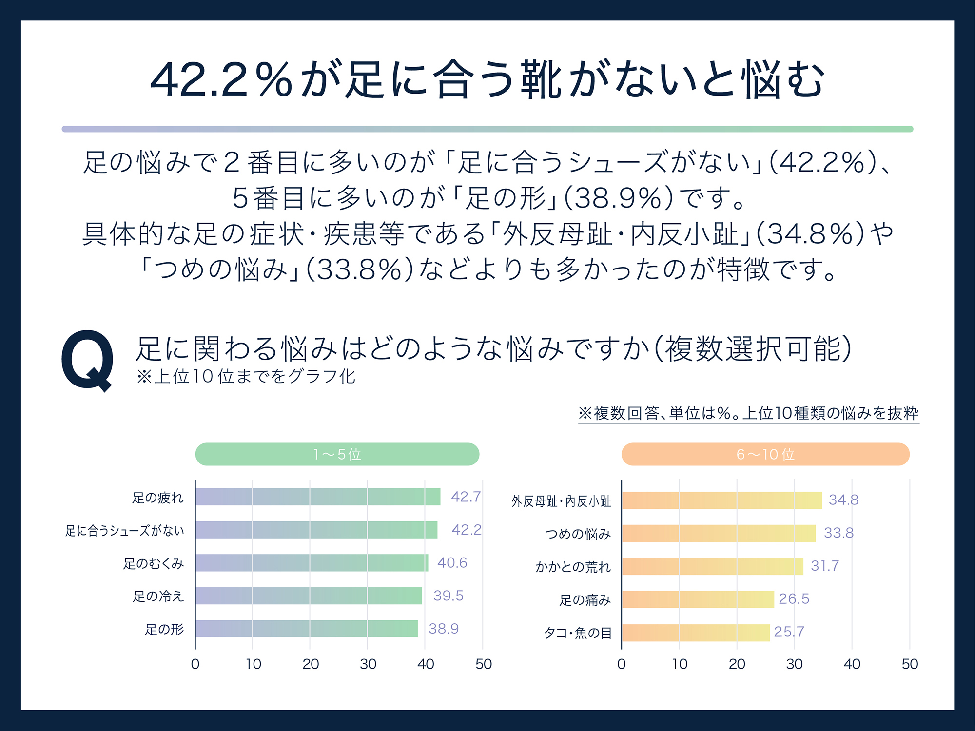 どのような「足の悩み」を抱えているかを尋ねたところ、2番目に多かったのが「自分の足に合うシューズがない」(42.2%)でした。「足の形」(38.9%)で悩まれている人も多いことがわかりました。