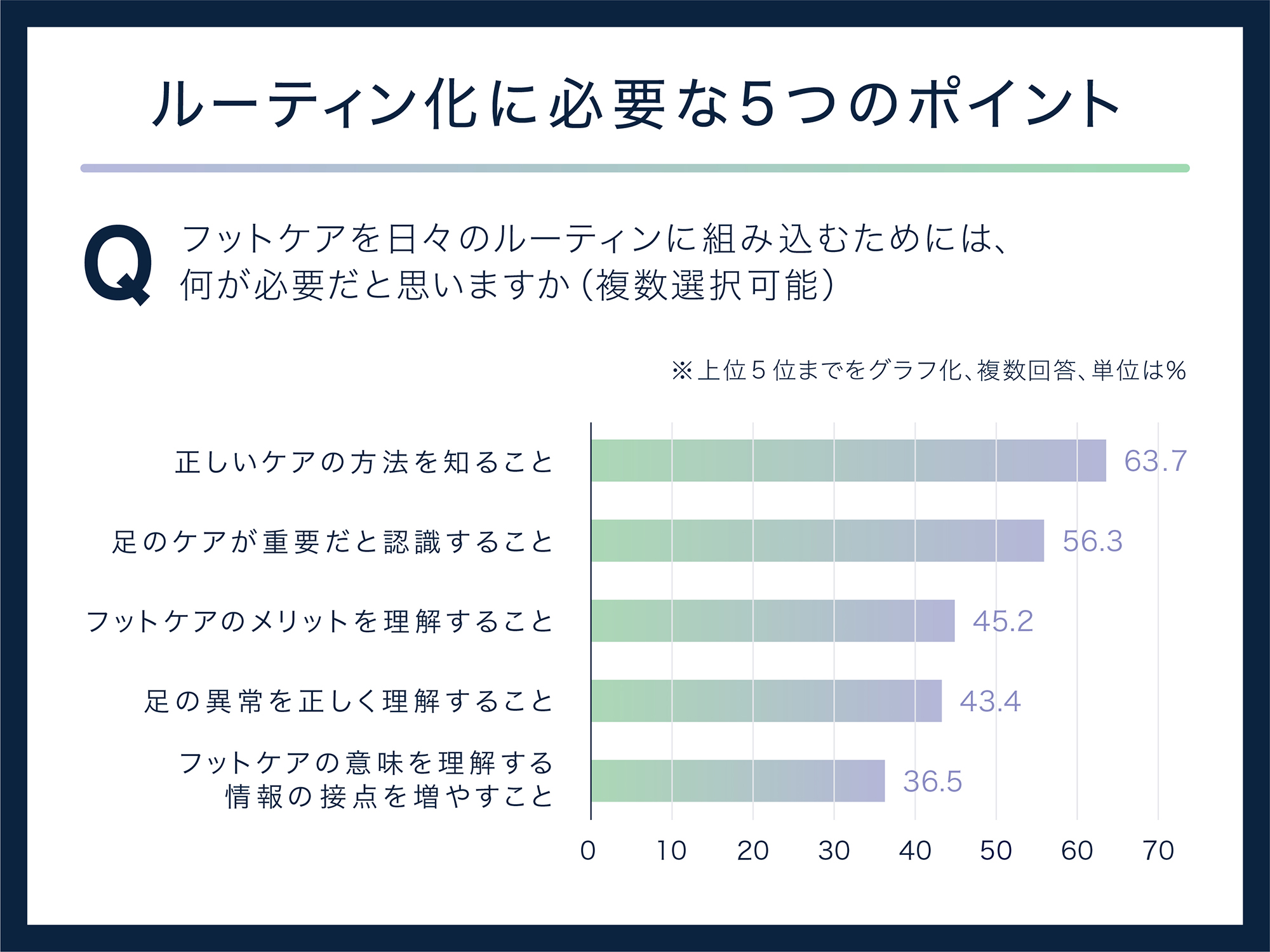 調査では、フットケアを日々行うルーティン化のためには何が必要かを尋ねたところ、5つのポイントが浮かび上がりました。
