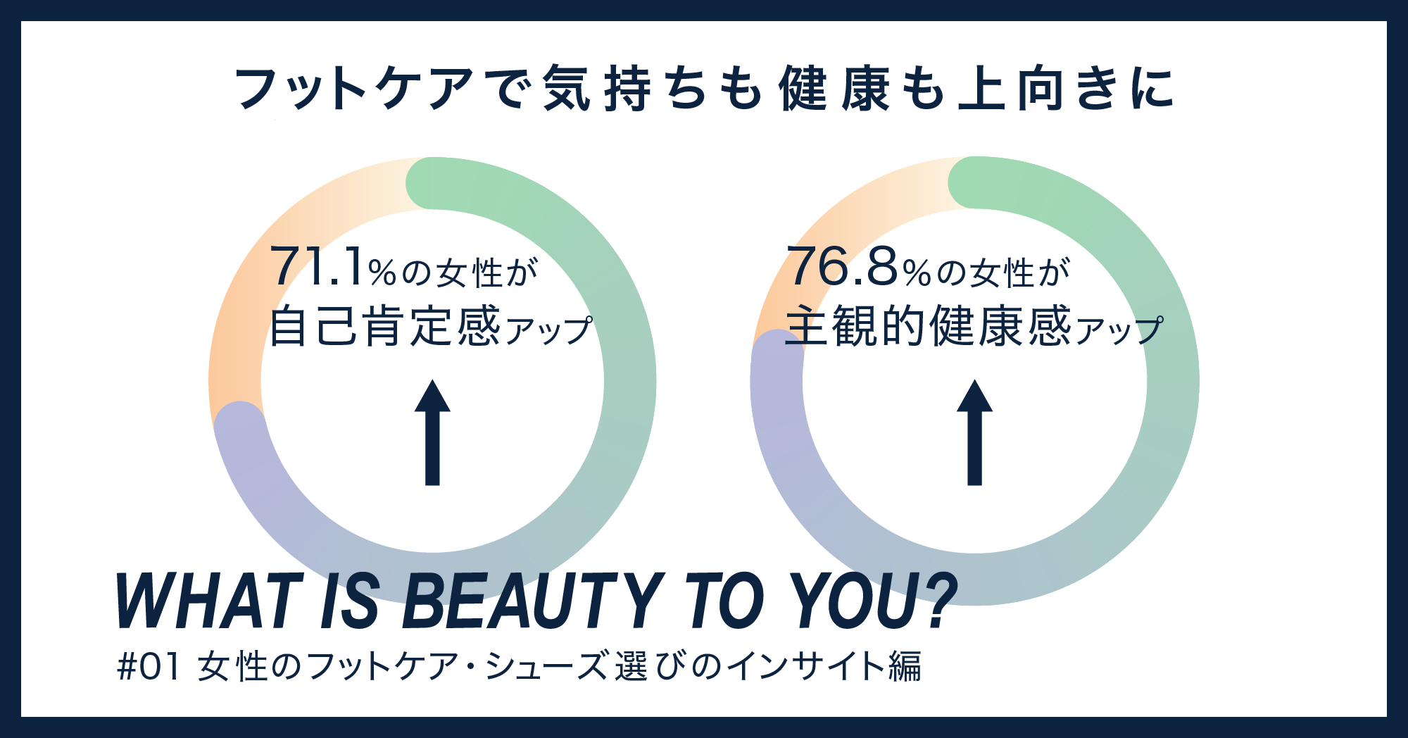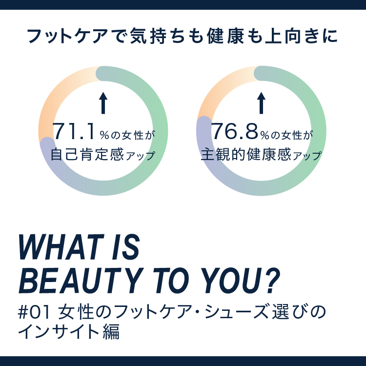 フットケアを行うことによって「プラスの影響があった」と感じている人は、自己肯定感で計71.1%、主観的健康感で計76.8%いることが分かりました。フットケアに取り組む人たちを深掘りしていくと、「歩くこと」「走ること」はリフレクションの機会でもあり、心身ともに美しくあり続けるライフスタイルを維持するペルソナ像が浮かび上がりました。また、95.4%の女性が「足の悩み」を抱え、このうち10代・20代から足の悩みを抱えている人が63.4%いました。悩みの種類では「自分の足に合うシューズがない」という人が42.2%いました。全3回シリーズで、「女性のフットケア・シューズ選びのインサイト編」「フットケアを取り組む人たちの実像編」「専門家のアドバイス編」を紹介していきます。(数字は小数点第二位を四捨五入)